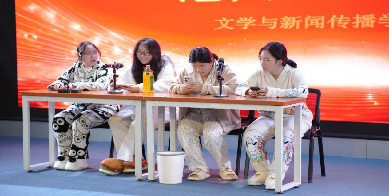 晚会以“寝室”为叙事核心,充分展现了各教学院“一舍一品”的文化建设成果。千纸鹤乐队带来的《突然好想你》、《简单爱》唱响了青春共情的美好;由学生自编自导的《宿舍寻宝大作战》、《查寝奇遇记》等情景剧,生动演绎了寝室生活中“规则与温情并存、个性与共性和谐”的成长故事;手语舞《裹着心的光》则无声传递了同伴支持与心灵关怀的温暖力量。晚会特别设置的颁奖环节,不仅表彰了在“2025年创意寝室文化设计大赛”中涌现出的优秀寝室,更将《忆中国》、《建军大业》等获奖作品所承载的家国情怀与集体精神予以彰显,体现了寝室作为思政教育前沿阵地的独特价值。