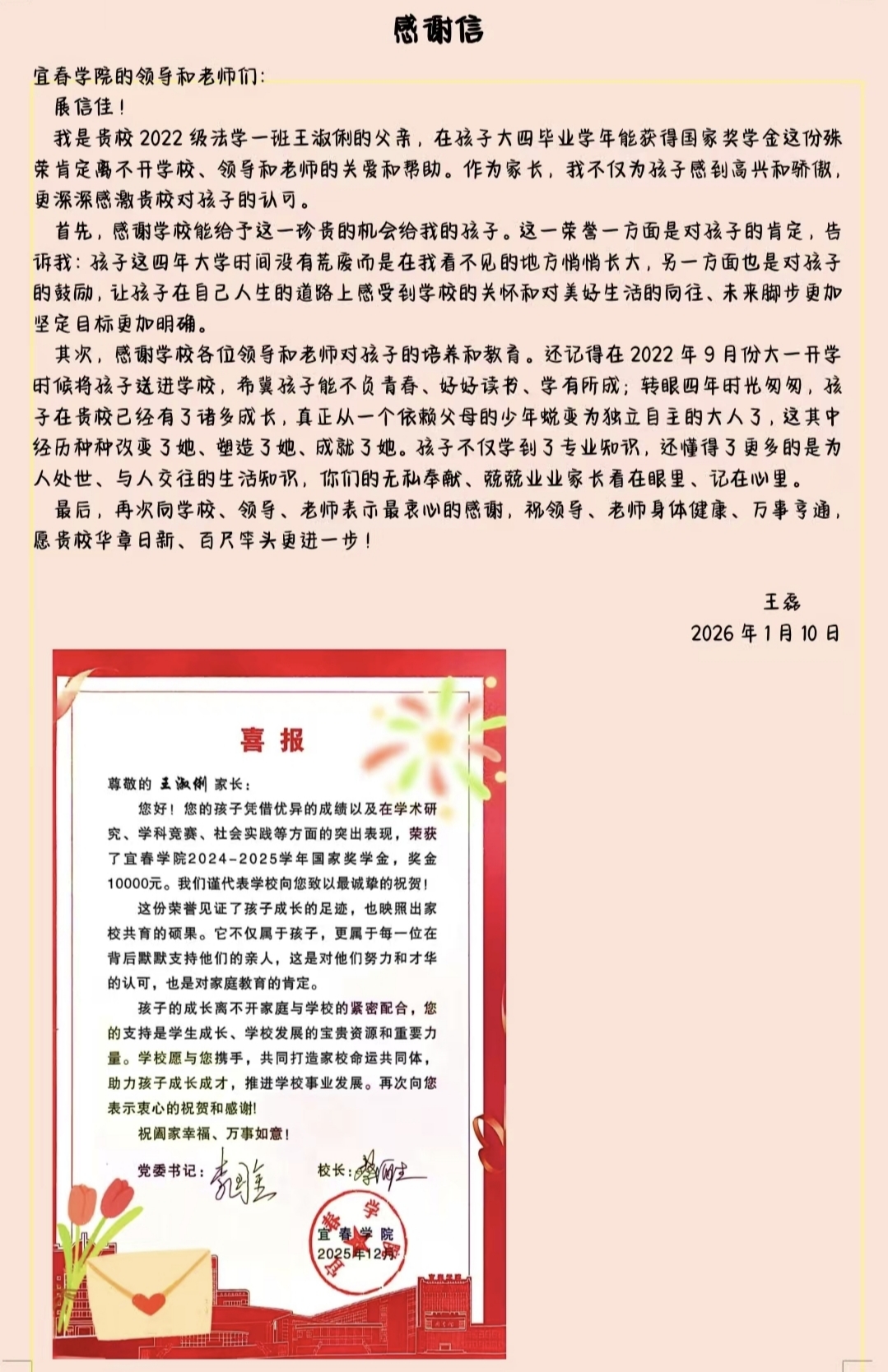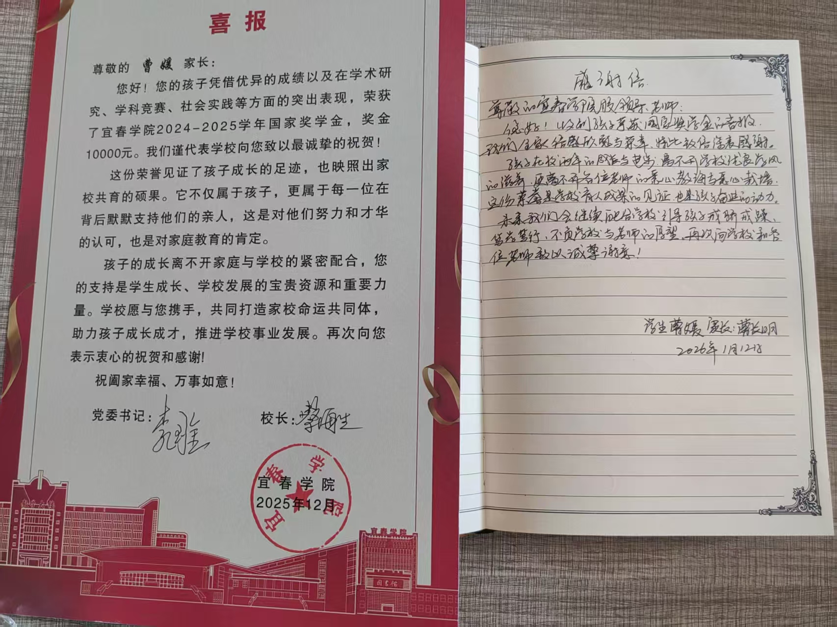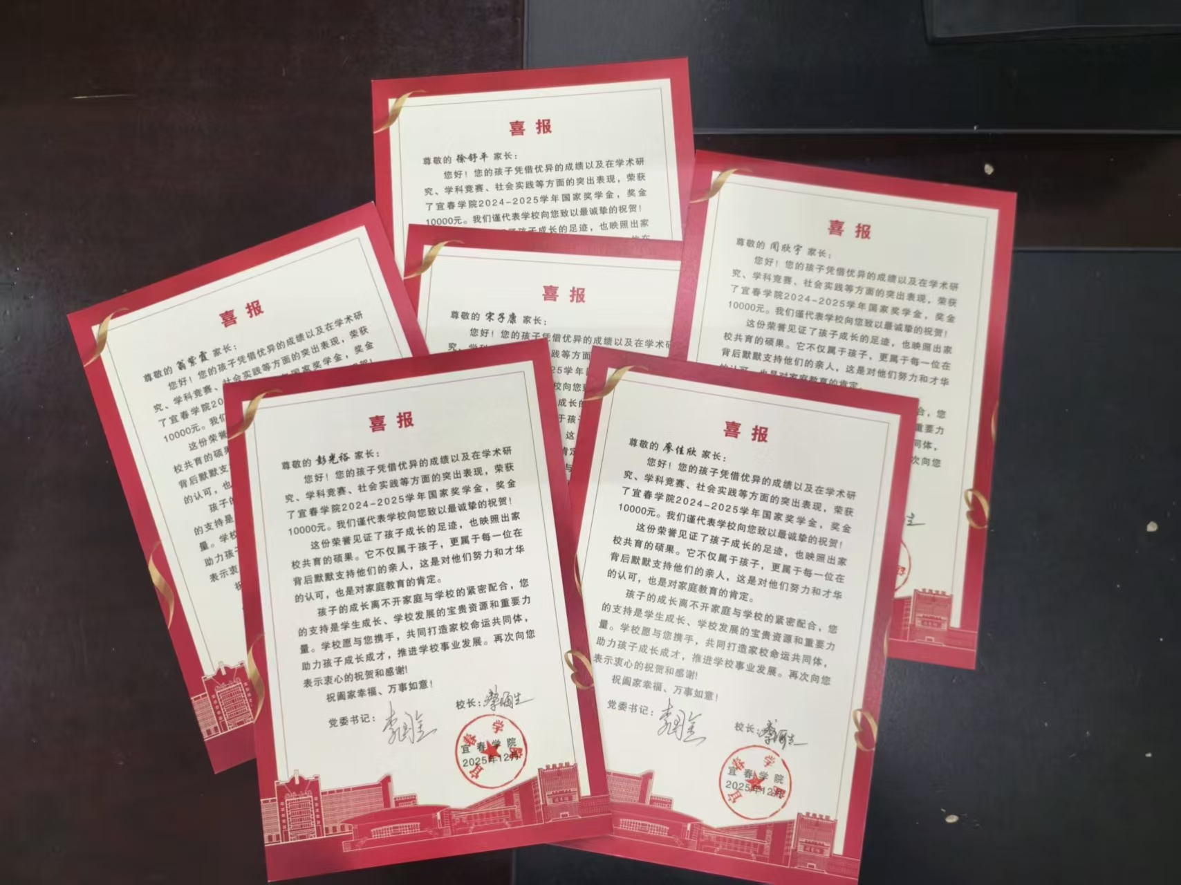 近日,宜春学院向荣获2024-2025学年国家奖学金的学生家长寄送了专属喜报,将学生在校的优异表现传递至家庭,以实际行动深化家校协同育人,共同见证学生的成长与荣誉。