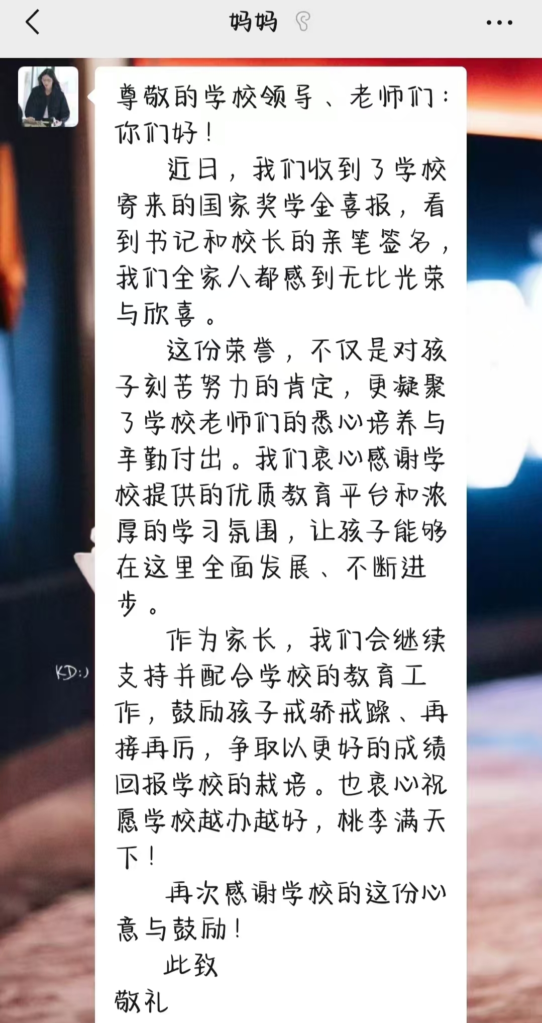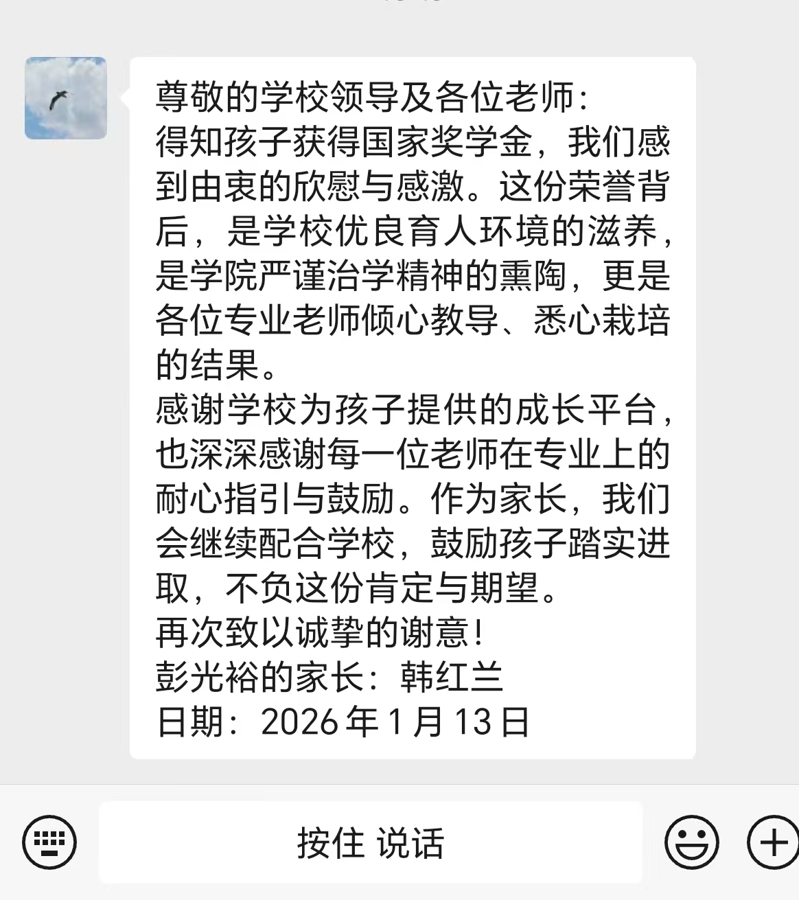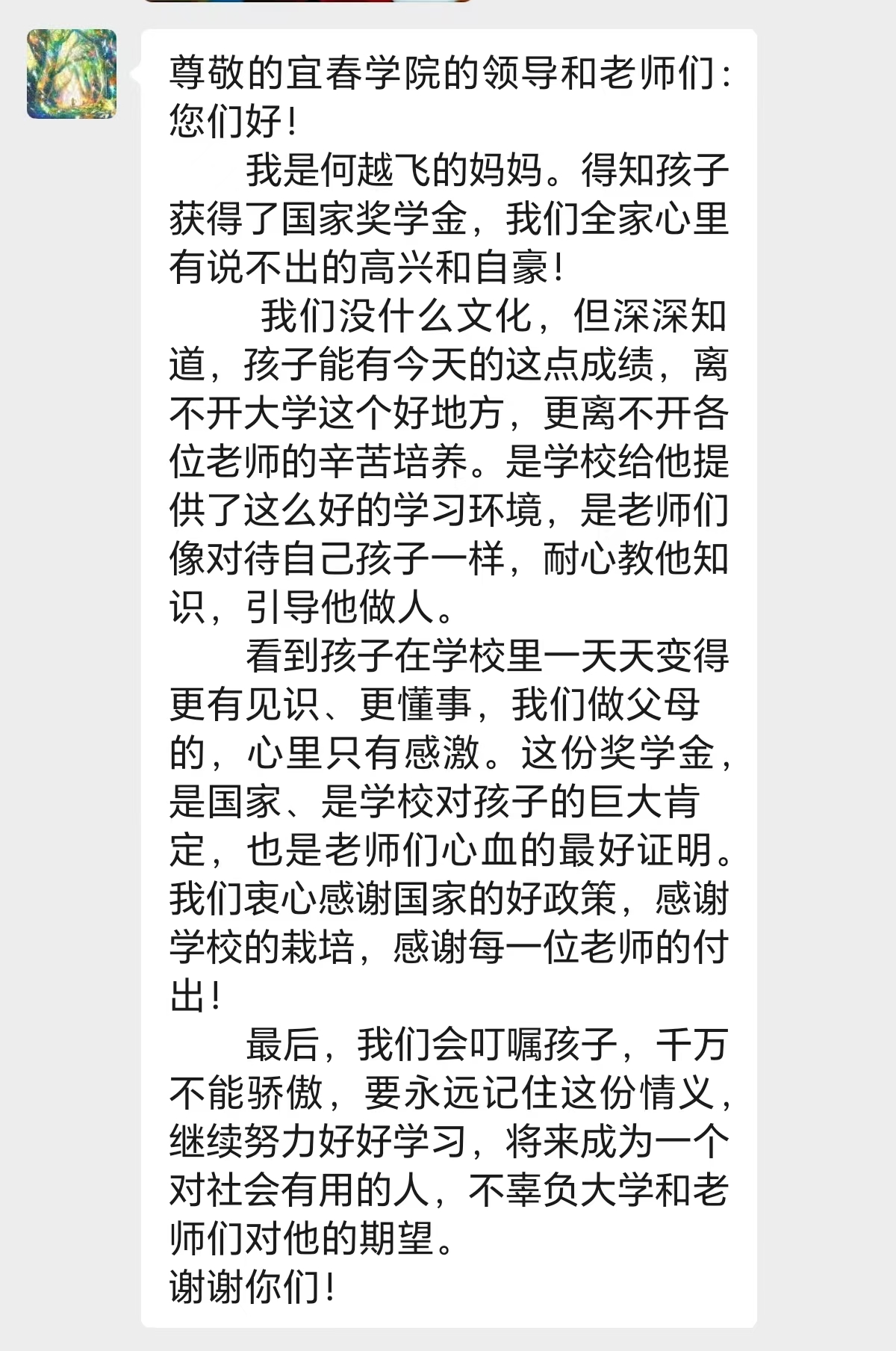 近日,宜春学院向荣获2024-2025学年国家奖学金的学生家长寄送了专属喜报,将学生在校的优异表现传递至家庭,以实际行动深化家校协同育人,共同见证学生的成长与荣誉。