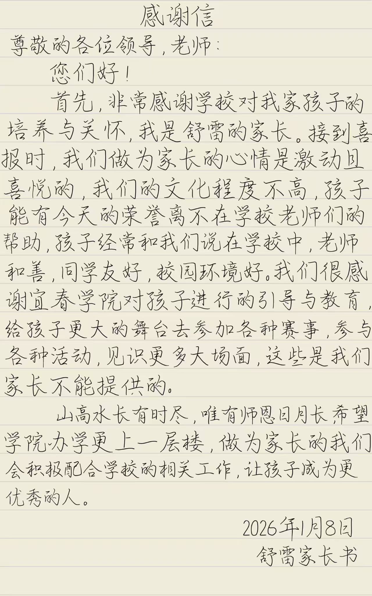 喜报虽轻,情意深重。它致敬每一位为理想不懈奋斗的宜春学院青年——那些默默耕耘、踏实向前的时光,终将照亮未来的旅途。我们也借此向始终支持孩子、信任学校的全体家长致以衷心感谢与新年的美好祝愿:愿您与家人四季安康,岁月温暖,万事顺遂,幸福常伴!
